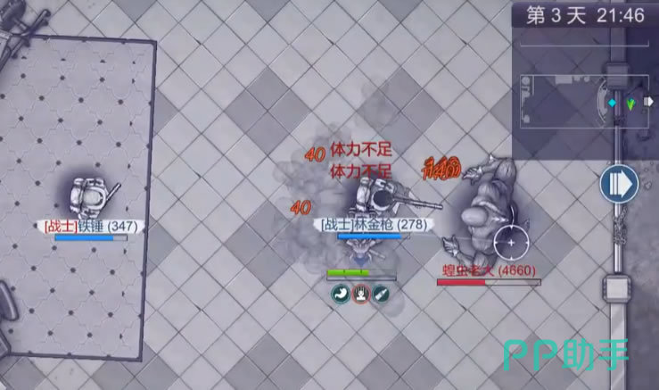 最后一点其实还是要做一些养成工作的,毕竟战场的获得有限;而且很多道具是只能自己生产的,比如蛛丝陷阱这种对于打Boss非常有效的道具,可以腾出一些时间专门去做。磨刀不误砍柴工,只是不用去做与推进无关的事浪费时间就好。一般来说,推进速度快的话,在第三天晚上就能攻入蝗虫总部面对蝗虫老大了。