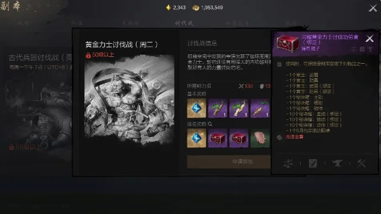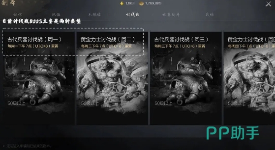讨伐战副本是一项高难度的在线活动,玩家必须达到50级或更高的等级才能参与。这份副本的关键分为两种类型:黄金力士讨伐战和古代兵器讨伐战。每周二、周四、周六开放,金而古代兵器讨伐战则在周一、周三、周五、周日开放,每次讨伐战的开放时间为每晚7日:30至8:00,玩家们需要在这段时间内进行组队并进入副本。