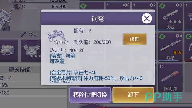 另外,钢弩可以同时攻击几个敌人,玩家还可以利用钢弩的远程的优势去攻打蜘蛛王这样的BOSS,既可以保持安全距离,又可以有效的消耗对方血量,所以钢弩是战斗时比较理想的选择。