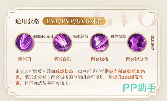 游戏的通用玩法是先用幽冥刃去叠加简易效果,然后再使用幽冥百爪,通过吸血效果维持自己的血量,然后用幽冥极梭打造爆发效果,最后用幽冥影分身收割。这里有的小伙伴或许会觉得幽冥百爪可用可不用,但大家要知道并不是每一次偷袭对方都是能够很稳定并且全身而退的,所以提前用这个技能最起码可以保持自己的血量,在一定时间内可以持续恢复,避免被敌人当场秒掉。