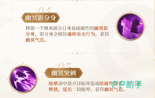 幽冥影分身是她的经典技能,可以释放一个自己的影子,这个影子会继承自己本体部分的基础属性伤害,还会模仿魂师的攻击,有一定的输出效果。幽冥突刺则是可以将自己的命中目标进行眩晕,而且能够二次释放这个技能,延长自己的晕眩时间,给队友提供输出环境,用来撤退也是很适合的。