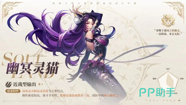 幽冥灵猫在游戏中是一个近战类型的输出职业,自身的攻击力是非常高的,而且十分灵活,所以有一定的操作难度,但是扛不住她的高颜值,还是有很多萌新玩家喜欢用。在很多的队伍当中,幽冥灵猫都是输出核心,能够快速出击,给敌人致命一击,往往可以瞬间带走敌方的输出位或者是辅助位。如果我方队伍当中有治疗系的角色,一定要在幽冥灵猫去袭击的时候注意她的血条状态,及时的给她补充血条预防死亡。