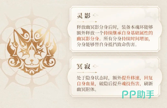 她的被动技能灵影可以在自己释放幽冥影分身之后,再次额外释放一个幽冥影分身,还能够持续继承自己基础属性,最重要的是所有分身的存在时间都会持续增加,而且分身也能替大家抵挡致命伤害,也可以理解成带有一定攻击属性的防御技能。被动技能冥寂则是在大家处于隐身状态的时候可以额外提升速度,并且回复自身的一定血量,可以在拉距离的时候使用,比如一套连招下来,一旦发现没能秒掉对方,就可以用这个来进行走位,恢复血量,等待刷新出来再次攻击敌人。