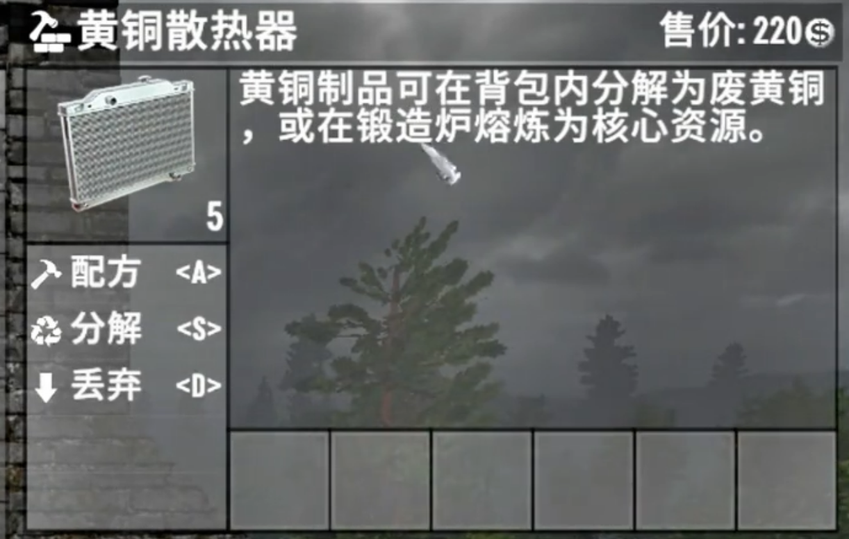 除此之外,游戏中还有其他途径可以获取黄铜,例如拆卸汽车、空调和暖气片获得的散热器,这些也是黄铜制品。但在处理这些物品时,建议直接将其放入炉中熔炼,以确保百分之百的资源回收,因为如果选择分解,回收率将降至80%。