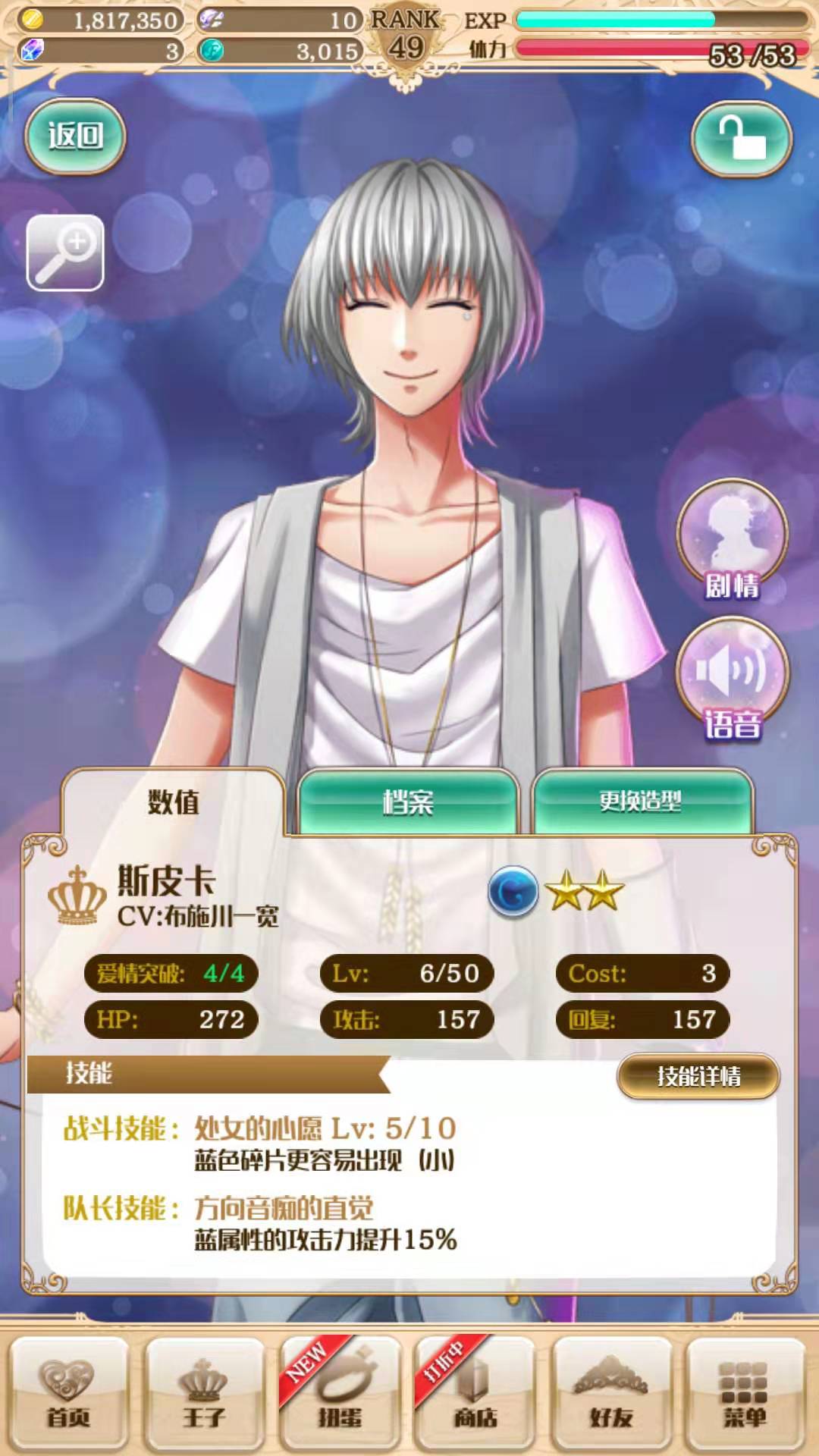 斯皮卡是蓝色冷酷属性的王子,抽到的时候初始星级是2星。他的个人技能是提升蓝色碎片出现的概率,队长技能则是增加蓝色属性王子15%的攻击力。