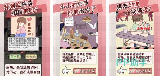 关卡数量众多并且每关都带有情侣之间的线索,玩家在每一关完成后点击进入下一关卡。线索搜寻方面,玩家既可以通过聊天记录发现直接的证据,也可以根据男主角今天装扮的头发等细节进行判断,还有脖子上的草莓等等。整体功能较为齐全,玩家提交线索即可得到是否判断正确的结果。