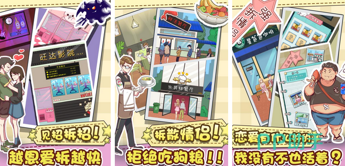 卡通动漫画风中,一对情侣在不同的场所进行约会。在剧情发展上,情侣可去的地方场所众多,不仅有经典的万达影院和米其林餐厅,玩家还可以在咖啡店和鲜活餐厅等多个社交场所出现。在其他设定方面,不仅有随机出没的小猫和小狗,玩家有时候还会遇到幽灵等怪物。