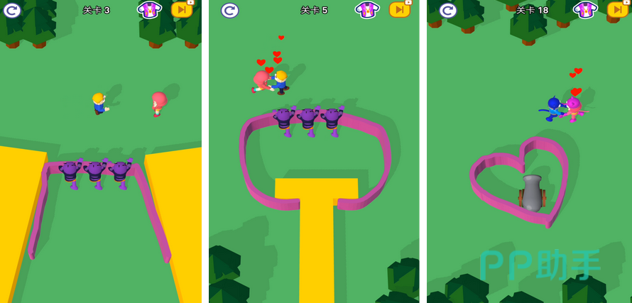 情侣的刻画方面,玩家在每一关卡中可以看见不同服装以及颜色区分的一对情侣分隔在两个不同的地方,有时还有NPC以及罐头等道具的阻碍。在服装板块,玩家可以更换他们的头发颜色以及装扮。具体操作较为简单,玩家利用现场的工具根据地形情况将他们连接在一起。