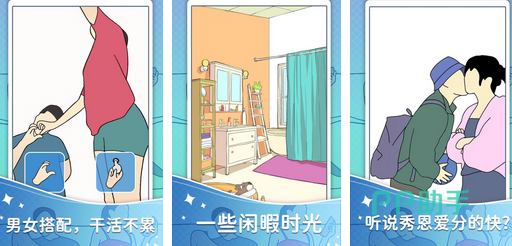 在简洁的卡通画风中,一对情侣根据习惯完成日常生活中的各项事情。在日常生活合作方面,男女通过互相搭配,完成衣橱等家具的安装以及摆放,按照双方的审美设计温馨小家。在闲暇时光里,情侣可以更换服装后外出约会。在亲密动作方面,情侣可互相亲吻以及长时间的拥抱从而可以感受爱情的甜蜜。