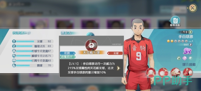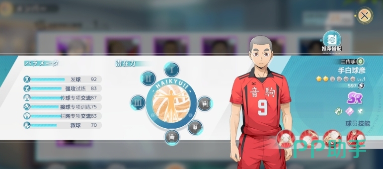由于游戏中的规则限制,目前游戏中每个球员在单回合内不能连续碰球两次,所以大家使用二传手的作用就变得尤为重要,手白球彦的主要任务是在比赛开始时进行发球,然后寻找机会进行二传球,帮助队伍缓解角球和扣球的压力,手白球彦的发球技能叫做天花板发球,这是一个专注于提升发球数值的技能,在游戏的前期,大家使用手白球彦发球往往能够在第一个回合当中就直接得分,这对于前期压制对面的球队快速完成游戏进程非常关键。