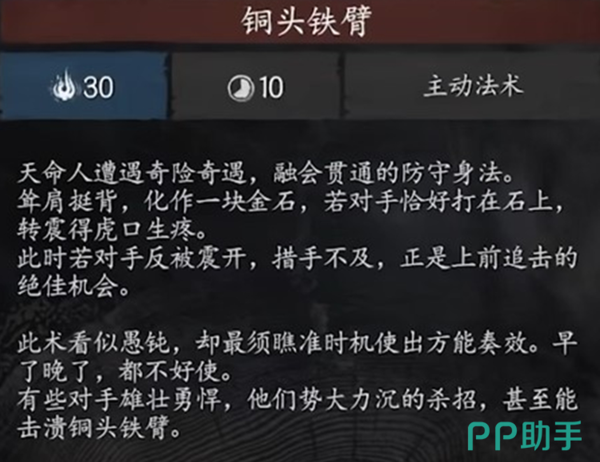 以上就是对黑神话悟空铜头铁臂方面的相关内容介绍,其实通过上面的介绍,相信很多玩家对铜头铁臂已经有了简单的了解。不过建议玩家,铜头铁臂虽说是比较强大的法术技能,但玩家在游戏当中也不要过度的去依赖该法术技能。