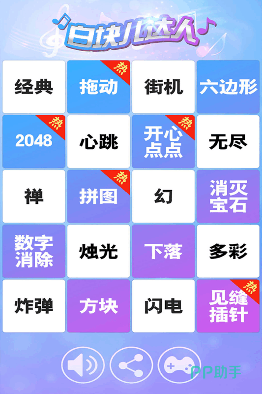 《白块儿达人》在音乐的引导下玩家们快速敲击屏幕上出现的黑方块,需要注意的是黑白两种方块是一同出现的,玩家们只能选择黑色的进行点击,敲击白方块就会导致任务失败,为大家加入了三大类速度节奏不同的模式,极其考究玩家们的手眼能力,在难度较高的模式下,玩家家必须保证一块方块都不能漏掉,才能成功通关。