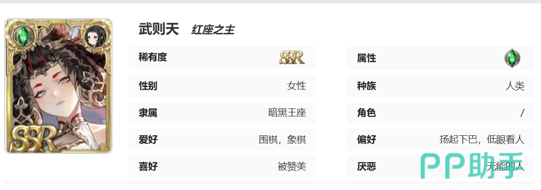 SSR级别的稀有度和好用的技能让武则天可以成为暗黑王座的巅峰角色,而且作为一位女性角色,她的相关剧情也是很精彩的,游戏中她有着不屈不挠的意志和对权力的渴望,人物讲解中她是从一个平凡的出生开始的,但她从未满足于成为他人游戏中的一枚棋子,她深知只有自己才能掌控自己的命运。