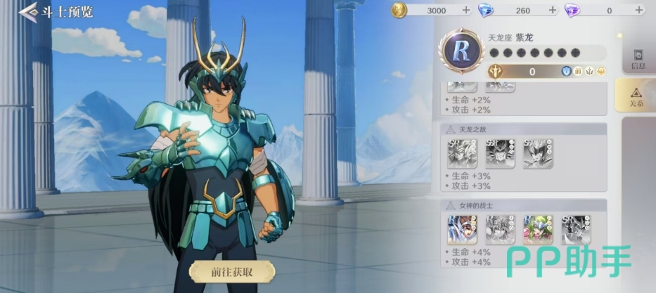 最后紫龙R还有一些羁绊技能,首先是庐山之师,可以增加1%的生命和1%的攻击,其次是黄金之缘,可以增加2%的生命和2%的攻击,然后是天龙之敌,可以增加3%的生命和3%的攻击,最后是女神的战士,可以增加4%的生命和4%的攻击,所以大家尽量依据羁绊效果来配合阵容。