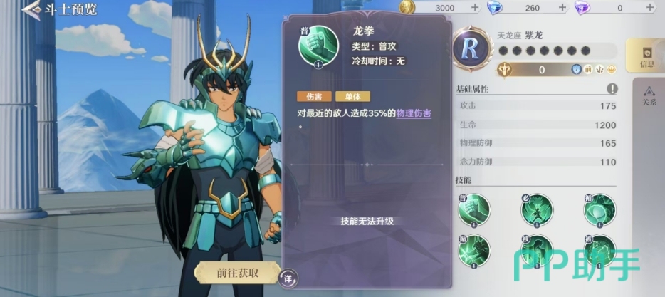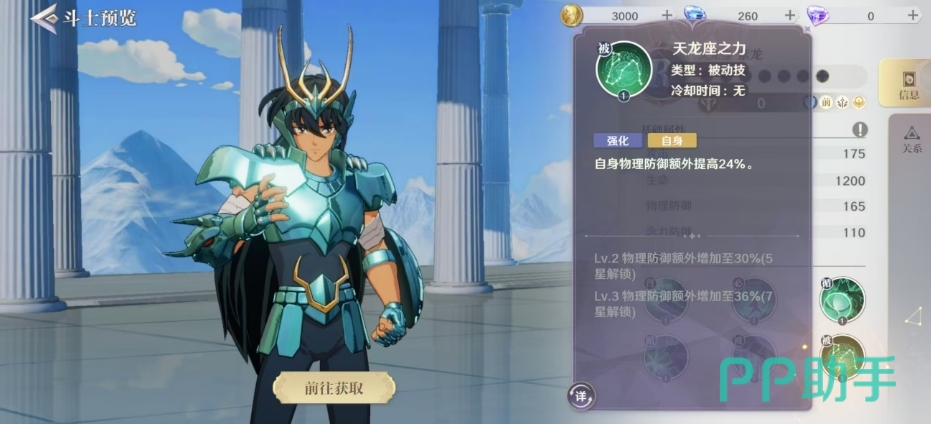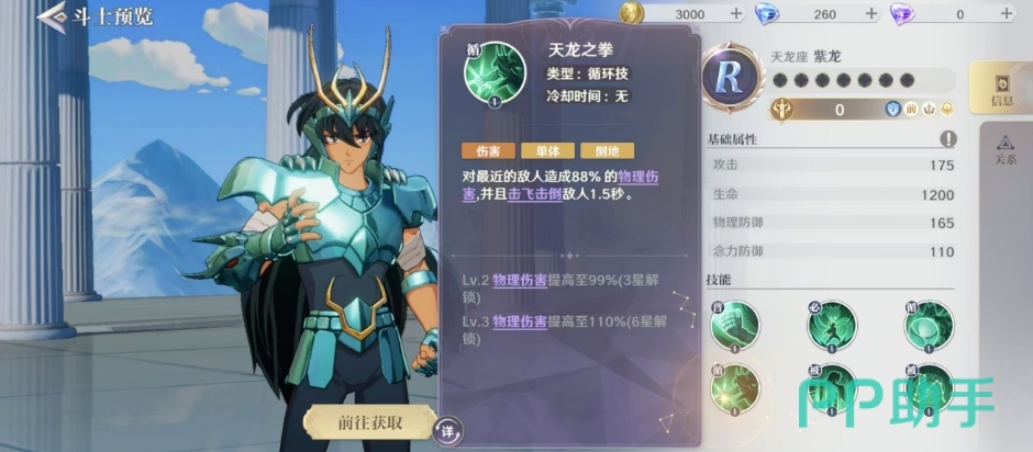 天龙座紫龙是游戏中的一名R品质角色,他拥有强大的被动技能和循环技能,首先他的被动技能是天龙座之力,这个技能没有冷却时间,可以强化自身,使自身的物理防御额外提高24%,当达到3级时,物理防御额外增加至36%,这需要通过解锁7星来实现,紫龙的第二个被动技能是青龙附体,每当他的最大生命值降低10%,他的物理防御就会额外增加4%,而当他达到3级时,物理防御会增加至6%,这需要通过解锁6星来实现。