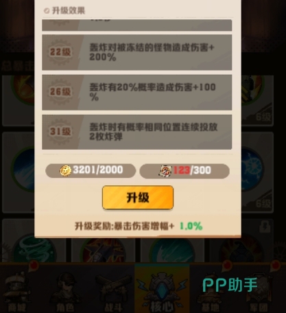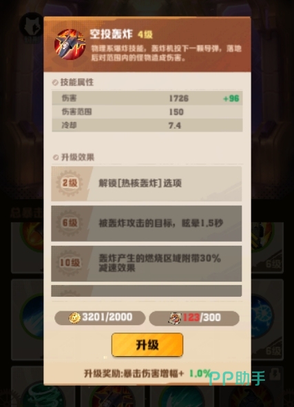 在大家去针对此技能提升的时候,可优先山考虑提升空投轰炸的伤害以及控制效果,如此就能够让它在战斗中更具威胁性,此外“地毯式”和“燃烧弹”,这些技能也是带来了更为广泛的攻击范围以及附加效果,是大家的首选哦。