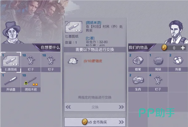 匕首图纸怎么获得呢,匕首图纸兑换的方式直接去村庄找村民乔换就可以,当然也是需要一定的兑换条件,玩家需要10个野猪皮才能成功兑换,野猪皮可以去找老猎户购买,当然如果想要节省资源自己直接去打材料的话,可以去森林亚麻产地通过狩猎野猪直接获得野猪皮,有10个野猪皮就可以兑换匕首图纸。