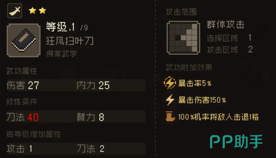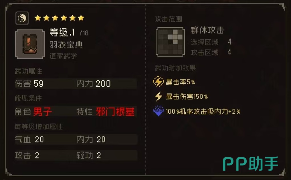 羽衣宝典是羽衣派的高深心法,修炼者必须自残身体才能够达到能阴能阳,能柔能刚的境界,是典型的江湖邪派武功,而且只有男子才能够修炼此功。它所附加的效果有100%几率攻击吸取内力加2%,属于群体攻击类型,选择区域4攻击区域4。狂风扫叶刀伤害27,内力25,100%机率将敌人击退一格。