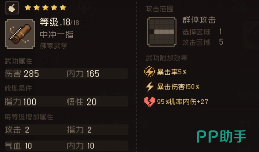 中冲一指:修炼要求指力100点,悟性20点,满级有285的高额伤害,同时可以再升级该武功的每一集中获取攻击力、指令各2点,以及气血、内力各10点的升级奖励,很值得缺属性点的玩家修炼。