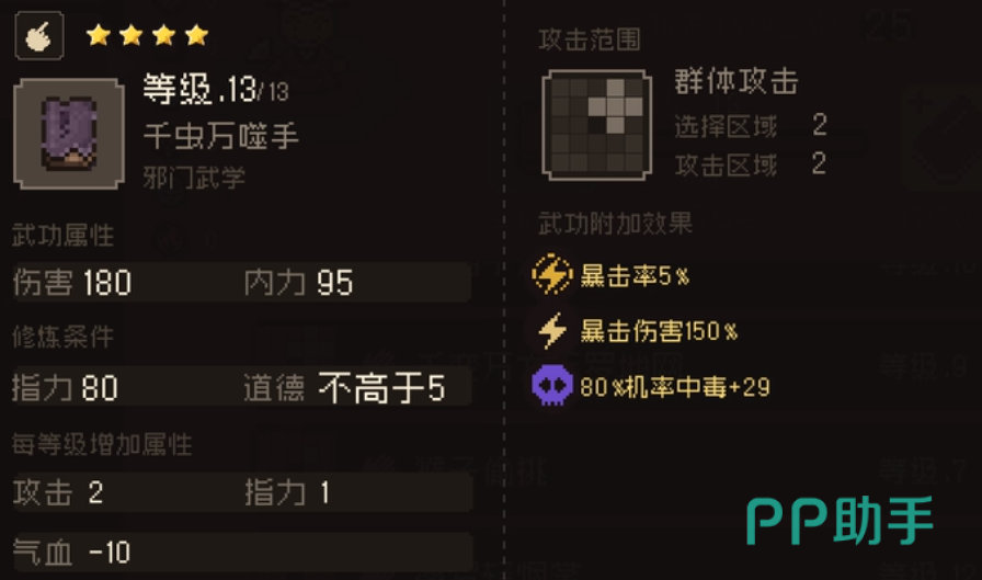 千虫万噬手:修炼的指力要求80点以上,道德不能高于5点,满级伤害有180。可以攻击两格内范围两格的敌人,带有80%几率中毒+29。有自带天赋是万蛊噬骨:加10点指力伤害,暴击5%与暴击伤害15%。学习方法需要在雁荡山打败顾净堂与岳三娘。