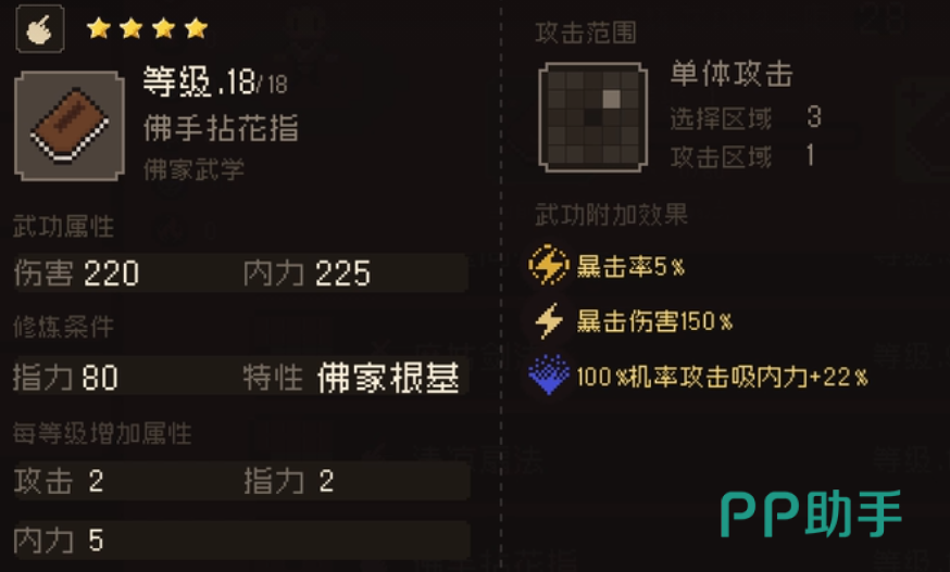 佛手拈花指:修炼要求指力80点以及特性佛家根基,满级伤害有220点,但是相对消耗也比较多,高达225点。天赋是拈花指决:指力伤害加10点,内力加5%。使用过程中100%机率攻击吸内力+22%的效果很好用,帮你节省药剂。学习方法从临安牢里面,搜和尚的恭桶。