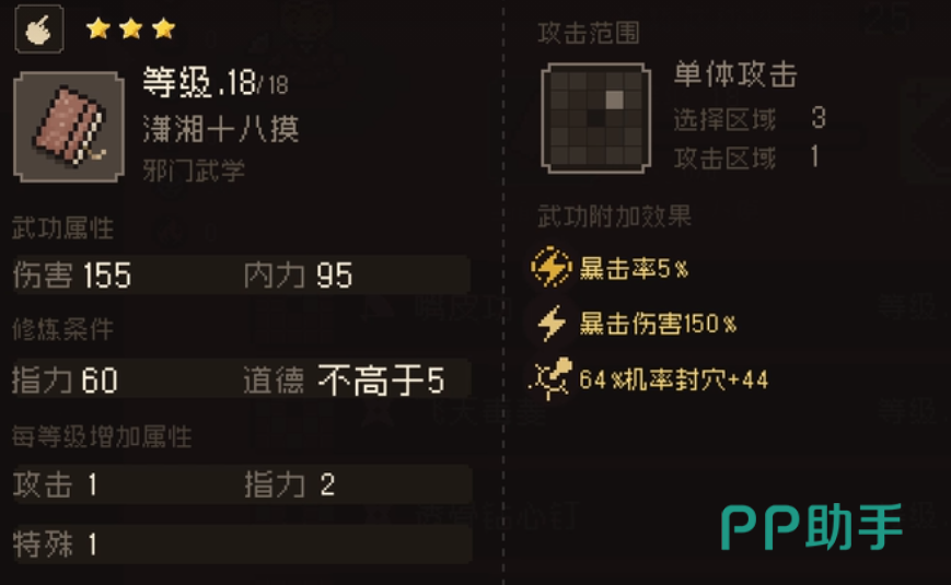 潇湘十八摸:指力要求60点,道德不得高于5,伤害满级155点,有封穴44点的加成,攻击范围是三格以内的单体敌人。这个武功的获取方法有几个,可以偷四大才子之一,或者在潇湘江湖的黑市里面购买。