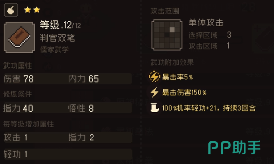 判官双笔:修炼需要的指力40,悟性8,满级伤害75,可攻击三格以内的单体敌人,是初期二星的执法武功,玩家可以通过做黑风寨的任务获取。