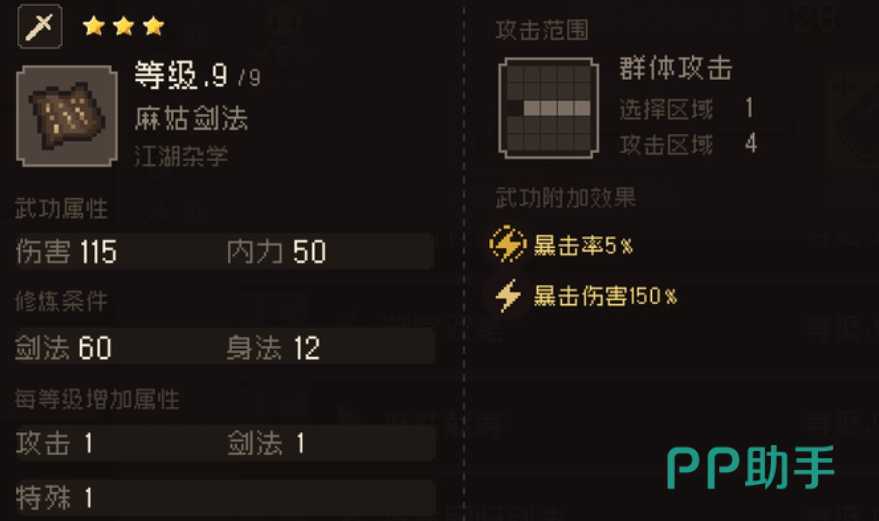 麻姑剑法:修炼需要剑法60,身法12,最高伤害可达115,可攻击直线四格范围的敌人,每一等级升级获取剑法、攻击力与特殊属性各1点提升。学习麻姑剑法的方式需要走主线,在青城论剑结束后选择1-2选项,庙里面争取麻姑入队。