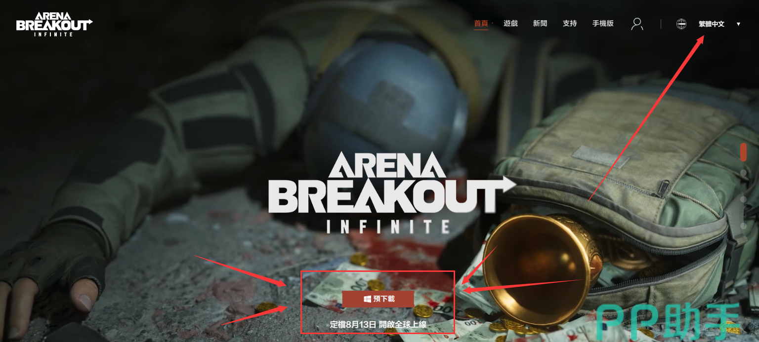 之后我们在biubiu客户端手游直接搜索”暗区突围“,即可找到该游戏,进入游戏专区后,会看到游戏名称旁【游戏下载】几个字,点击下载按照提示操作即可。首先跳转到海外版官网,然后我们可以点击右上角切换一下繁体中文,这样就可以看懂页面内容了。