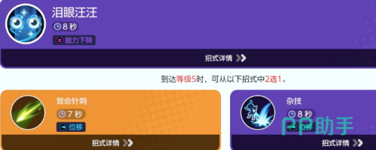 千面避役的第一个招式是“眼泪汪汪”,它能够降低对方的攻击力并提升自身的移动速度。升至5级后,玩家可以选择两个不同的升级方向。选择“致命针刺”,可以发射尖针造成伤害,并且具有穿墙特性。选择“杂技”,则能进行滑翔位移,增加机动性的同时积累会心能量。