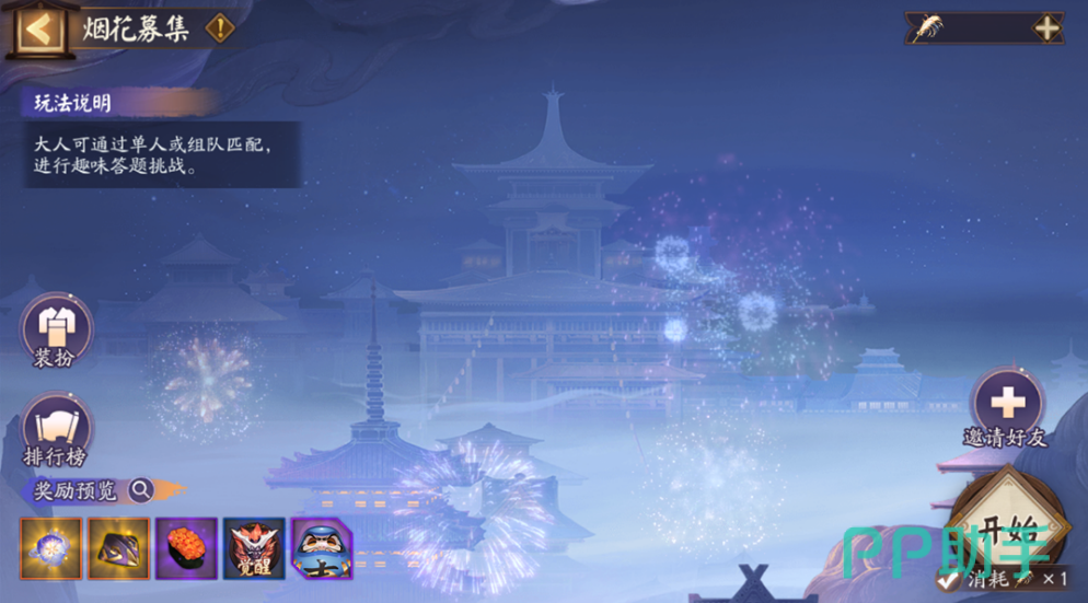 玩家可以通过消耗“烟花笔”参与答题挑战,无论是单人还是组队模式。答对越多,积分越高,最后积分最高的玩家将成为当日冠军。活动期间,首次登录和每日0点可以免费获得两个“烟花笔”,最多可存储六个。此外,如果储存达到上限,玩家还可以用勾玉购买额外的“烟花笔”。排行榜上的优秀玩家将获得限时聊天挂件作为奖励。