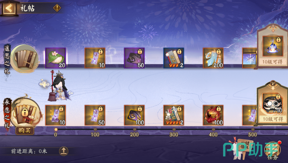 通过完成日常任务和达成成就,玩家可以积累“礼帖经验”,进而提升行进距离并获取独特的名染与点触奖励,你还可以通过购买“承愿之礼”来将御行达摩碎片、五星奉为达摩等更为珍贵的奖励进行解锁。