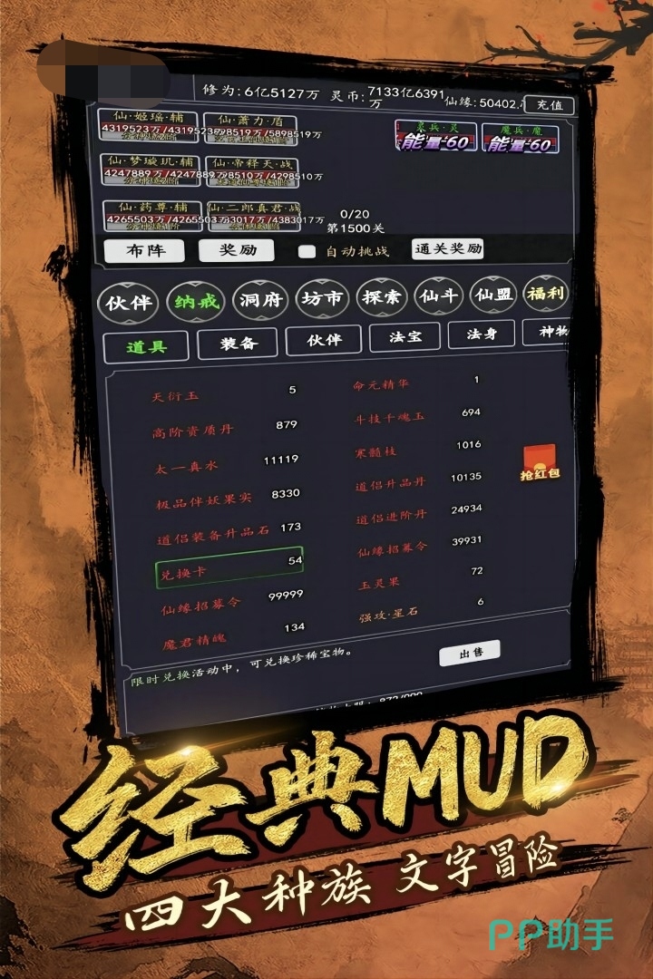 在这款修仙题材的rpg游戏里玩家将体验到以文字为主的修仙之路,并且其中的一切游戏内容都是靠文字来给玩家游玩的。另外,游戏中有着四大修仙种族来让玩家们选择,并且还可以招揽许多道友来陪你一同作战。有趣的是,其中还有着洞府以及坊市等等新奇玩法。快来体验一下文字版的修仙生活吧。