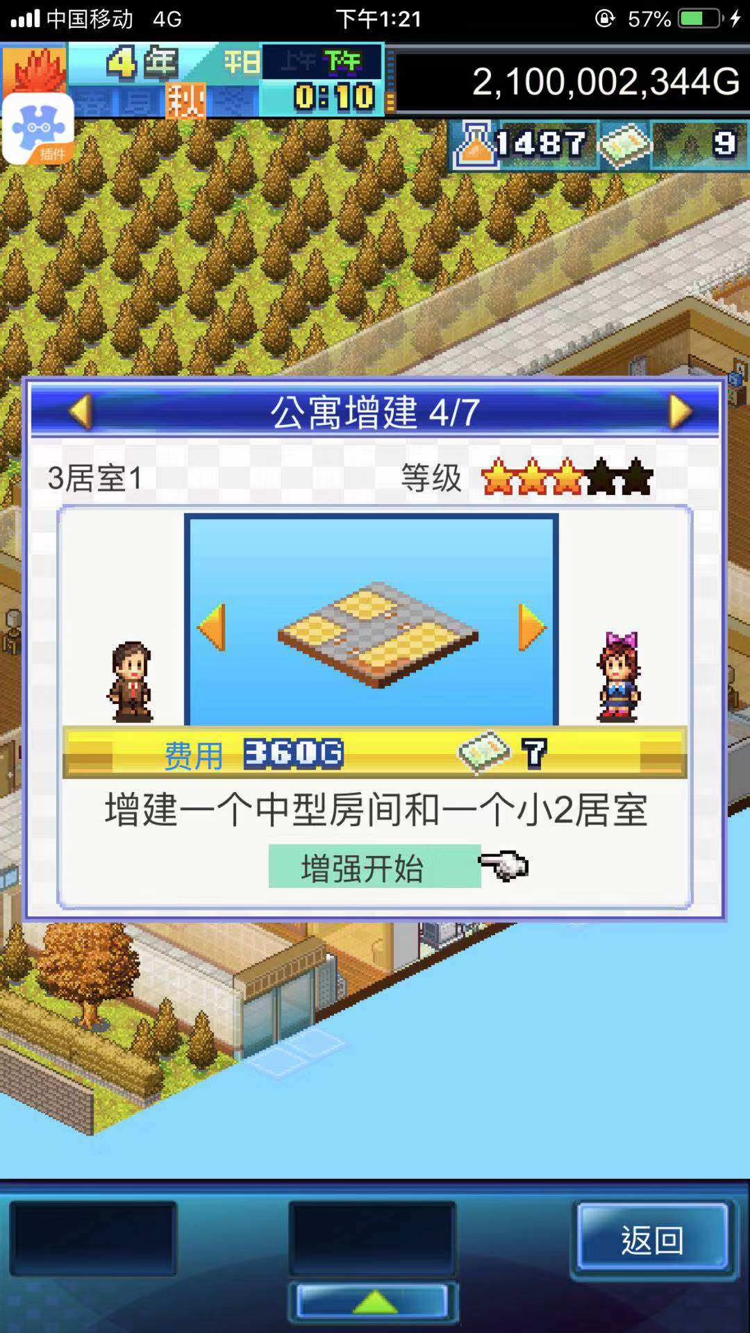 第二步:这里我们只要让公寓住满4个人,接着就可以开始公寓的扩张了,扩张的时候选择目前能建的最大的房间。把其中一个房间按照第一步的方法摆满家具就行了。