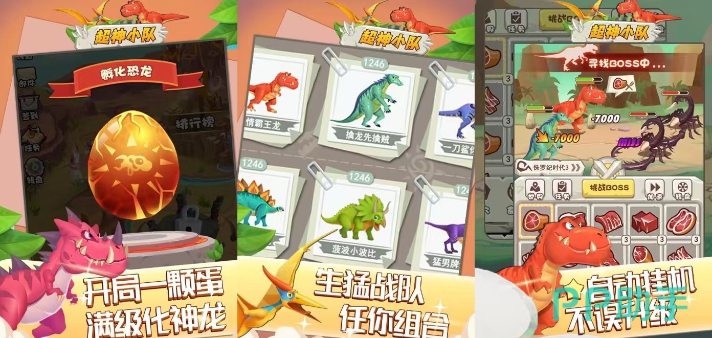 《超神小队》游戏里拥有着各种不同种类的恐龙,野外地图散落着各种恐龙角色,完成任务也会奖励恐龙碎片,恐龙蛋可以在孵化之后获得角色,玩家需要去对这些恐龙进行升级和养成,组建成一支超神的战队。游戏中会为玩家颁布众多的任务,可以自由选择去完成获得更多的奖励,玩家需要通过任务获得饲料来喂养恐龙,用恐龙和敌人进行作战。