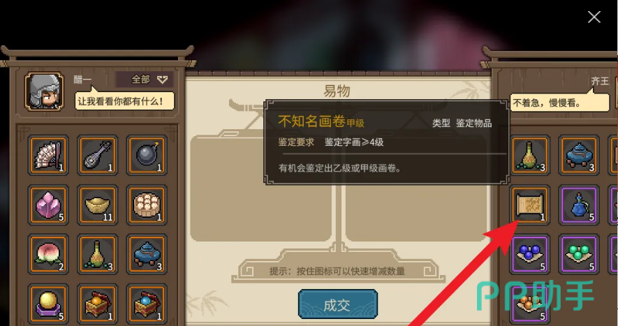 最后,根据所需的物品种类和数量,从你的物品栏中挑选相应的宝物或装备放入交换框。确认无误后,再点下“成交”,伴随着一声轻轻的提示音,那张传说中的甲级不知名画卷就归你所有了。