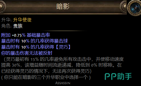 暗影可以获得0.7%的基础暴击率,在暴击的时候还有10%的机会可以有效得到暴击球。到了后期还能迅速的提高30%的移动速度,一旦在降至到0%的时候,马上就会被移除。