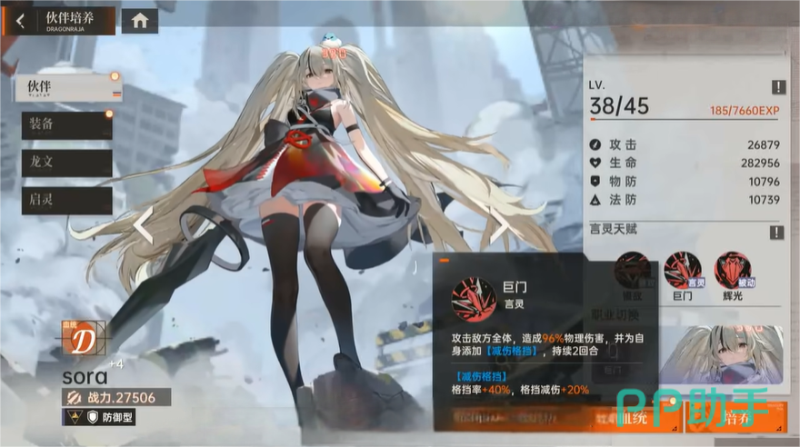 在防御型角色中,血统等级为D的sora却有超出其血统的水平,其言灵“巨门”也与其可爱的形象有着天壤之别,该技能使用后会对敌方全体角色造成少额伤害,但是会为自己添加“减伤格挡”这一buff,大幅度提高格挡率与格挡减伤,为全女队创造更好的输出环境。
