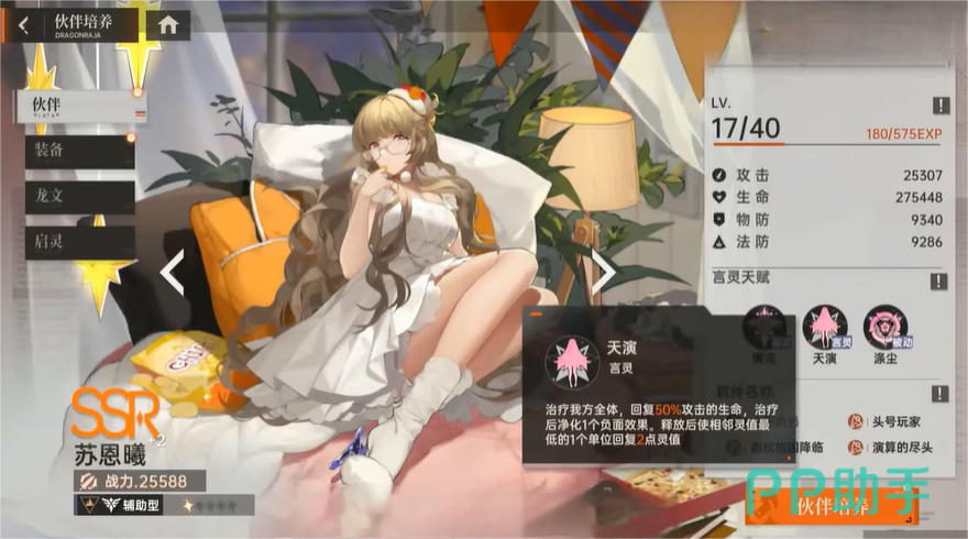 在辅助方面则有着苏恩曦与夏弥两位同为SSR的女性角色,苏恩曦的言灵“天演”可以为我方全部角色回复生命,同时驱散我方角色所受到的一个负面效果,并且回复相邻角色的灵值,使其能够更快的进行言灵的释放。而夏弥则能通过言灵“风王之瞳”来对敌方全体角色造成法术伤害,同时有概率驱散敌方角色身上的增益效果,从而使我方角色能够更好的进行输出。