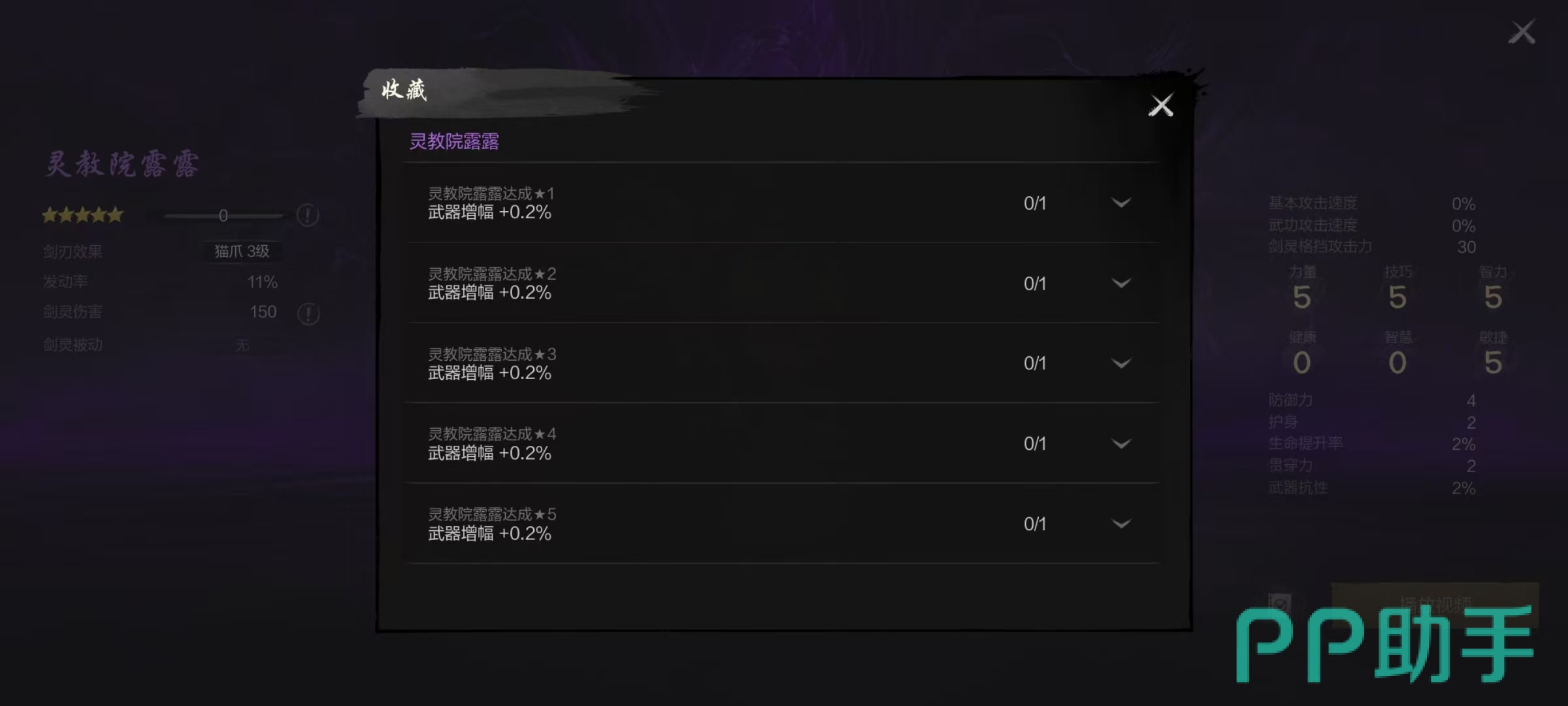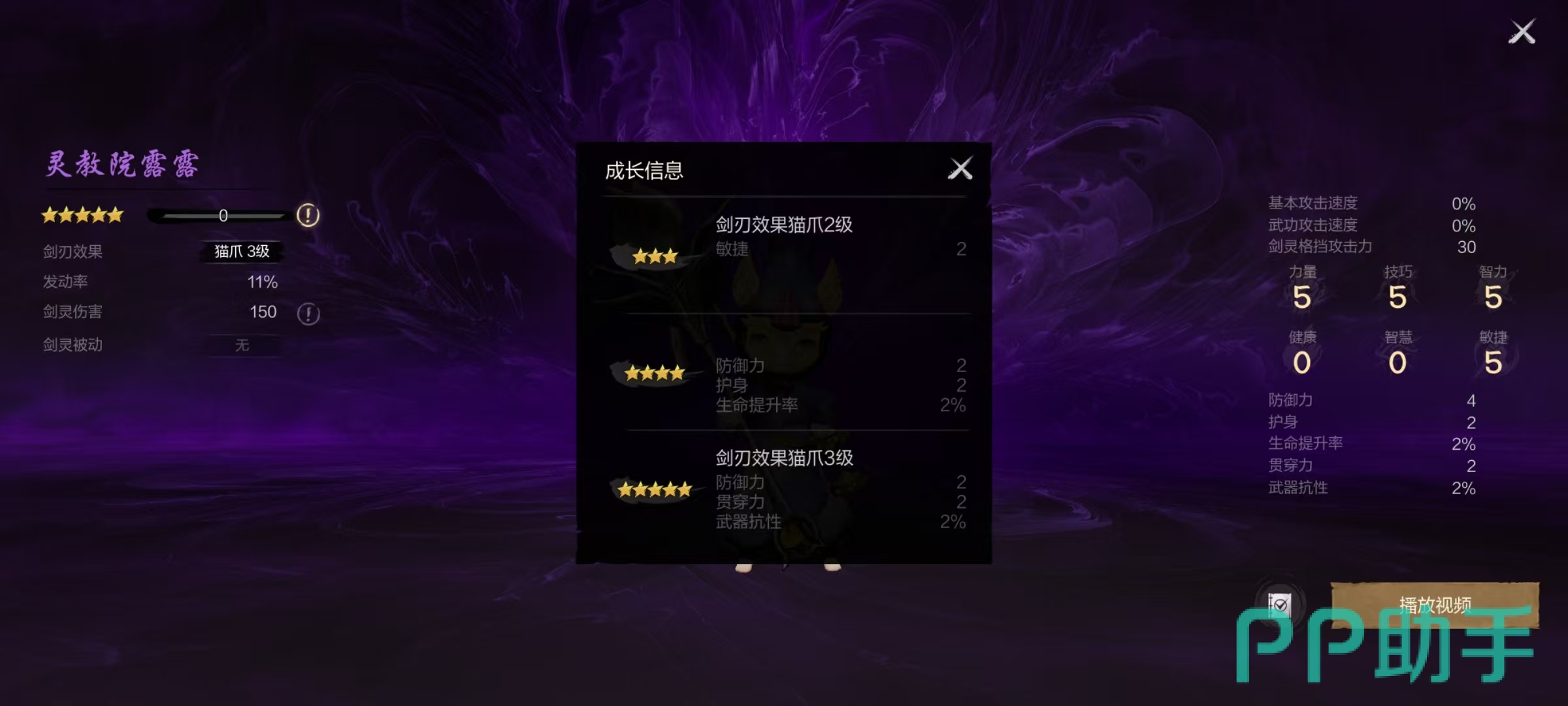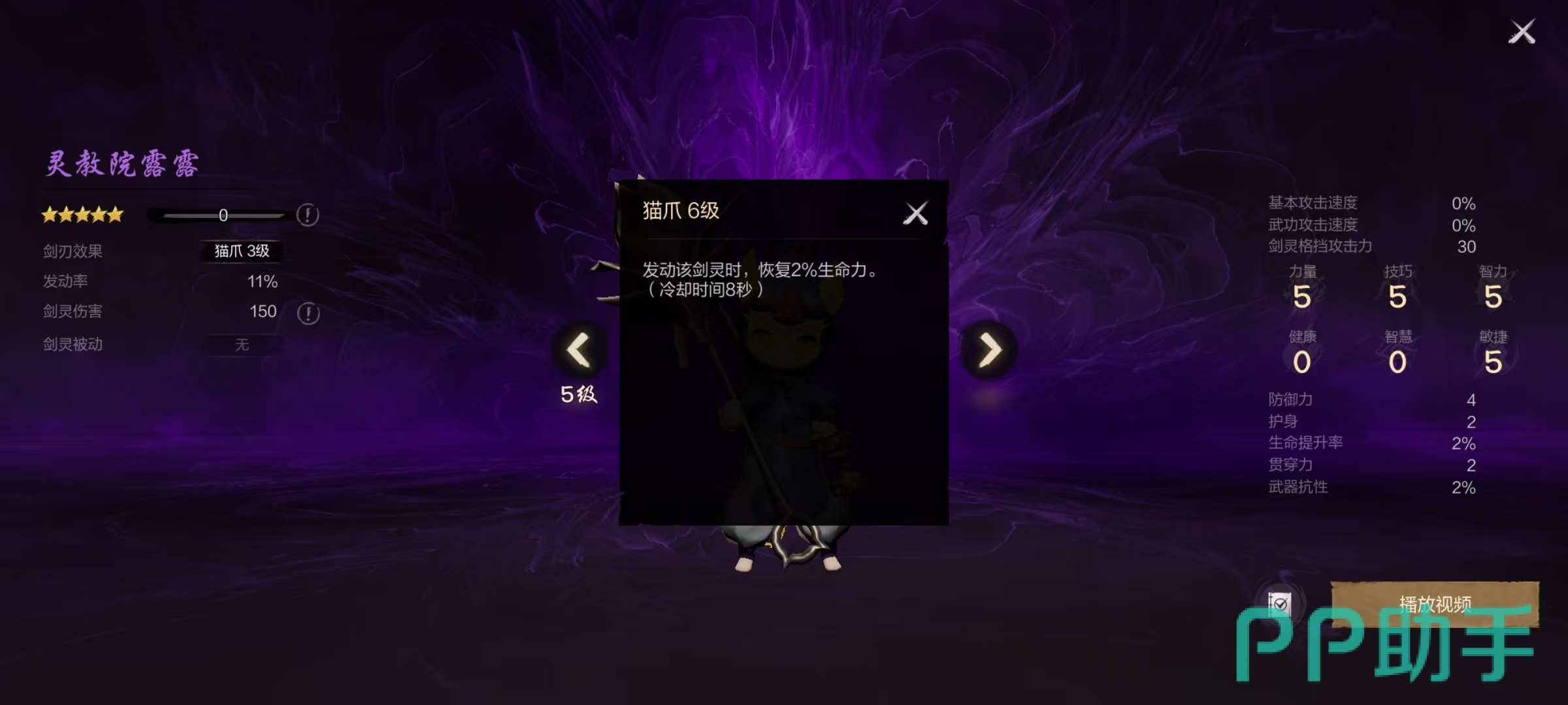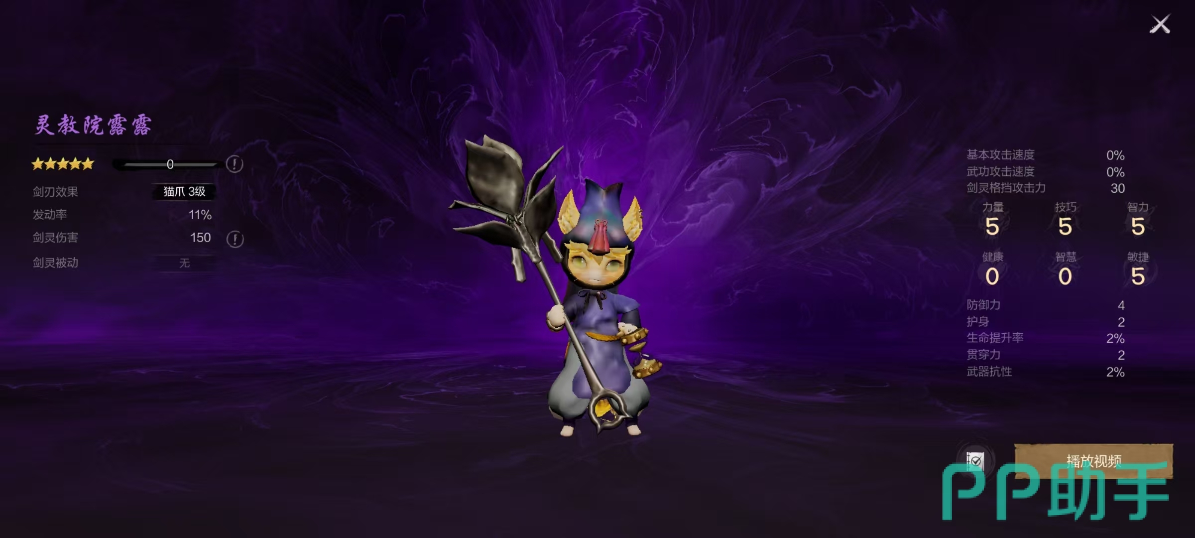 灵教院露露在外观方面非常可爱,他的剑刃效果是猫爪,在猫爪三级时发动,该剑灵能恢复1%生命力,冷却时间12秒钟,效果发动率是11%,剑灵伤害为150。在基础属性方面,它的力量、技巧、智力和敏捷都是5点,健康和智慧是零点,还拥有4点防御,2点护身,2%生命提升率,2点贯穿和2%武器贯穿力等属性。