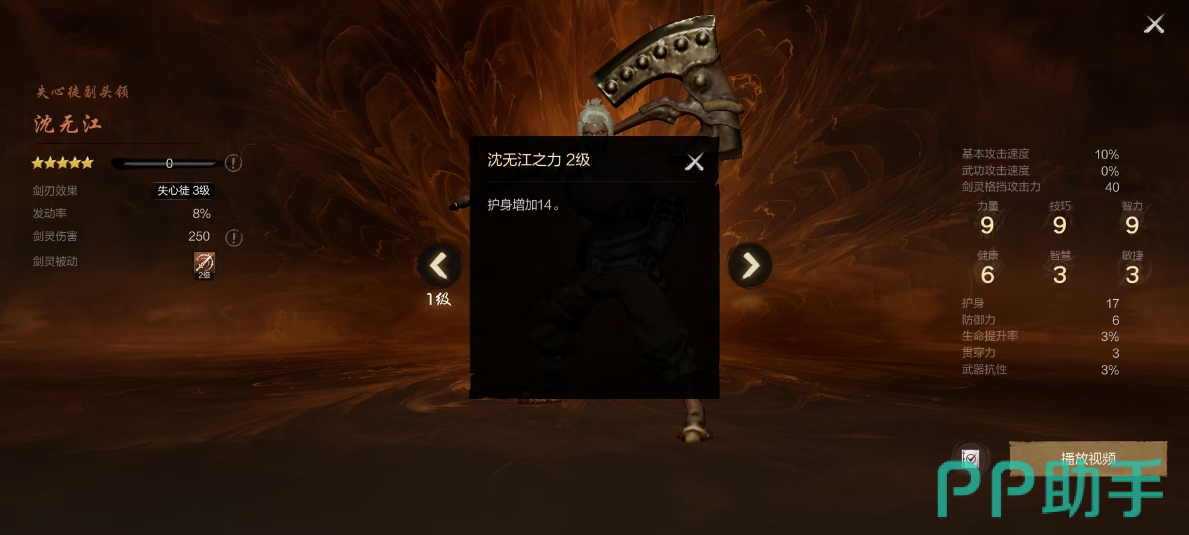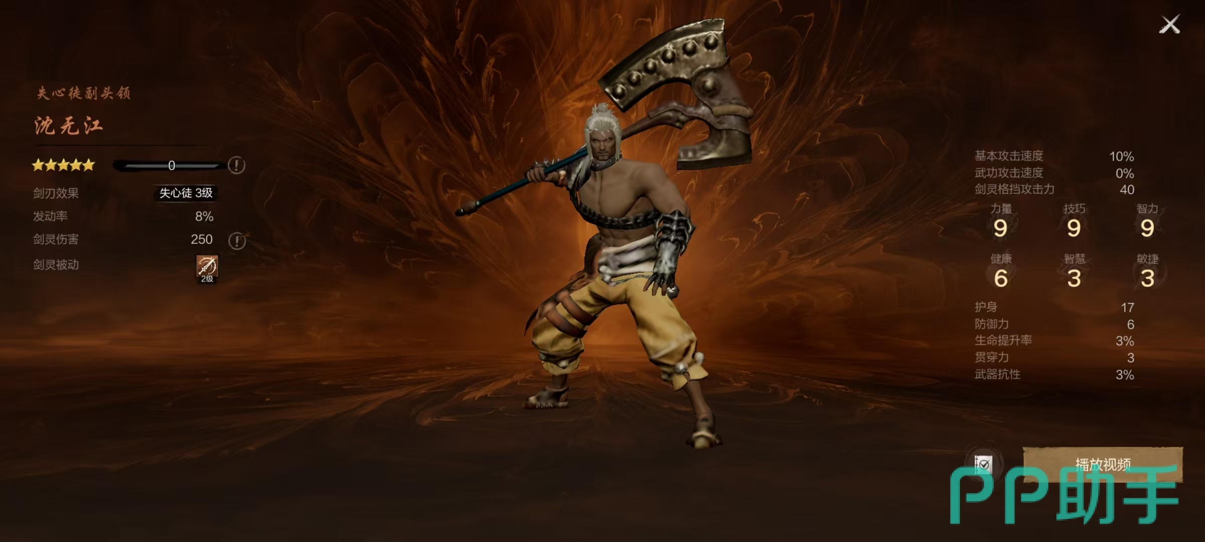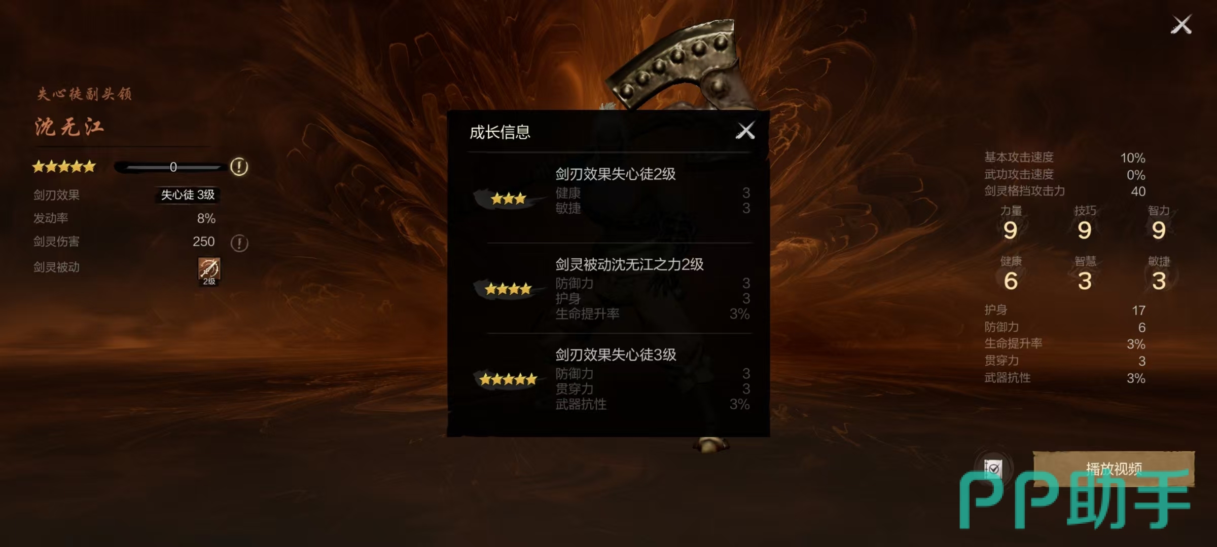 沈无江在属性方面比较高,它具有9点力量、技巧和智力,6点健康,3点智慧和敏捷,以及17点护身,6点防御,3%生命提升率,3点贯穿力和3%武器抗性,基本攻击速度10%,剑灵格挡攻击力40。
