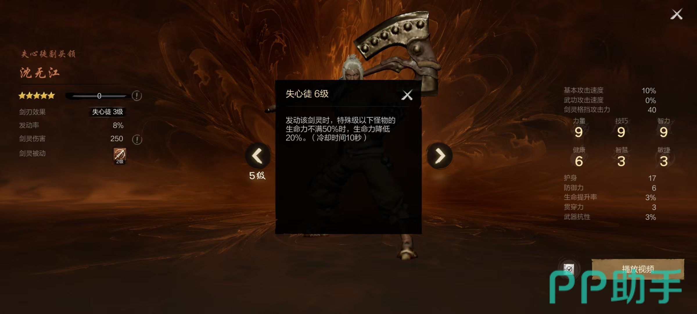 所拥有的剑刃效果是失心徒,发动该剑灵时,特殊级以下怪物生命力不满50%的时候,生命力降低8%,冷却时间10秒钟。这样在对抗特殊级以下怪物的时候,沈无江所造成的伤害就能提升很多,另外自身所拥有的被动沈无江之力,还能额外增加护身属性。