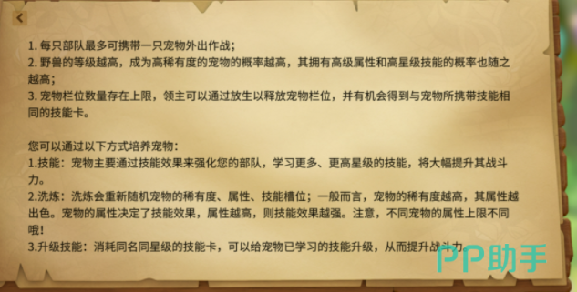这里还需要注意的是,由于在爱对战的时候,每一个队伍最多只能携带一个宠物进行对战,而且野兽的等级高的话,那么去洗练时,宠物的稀有度也会越高,但是这个是概率问题,通杀这个宠物的数量是要上线的,玩家们在收集满宠物的时候,可以选择通过放生的方式,去放生一些评级较低的宠物,而且在放生后,是要概率可以获得相关宠物所携带的技能,这个设计就非常的值得大家去进行尝试了!前期在洗练道具不够的情况下可以多多去收集低阶宠物!