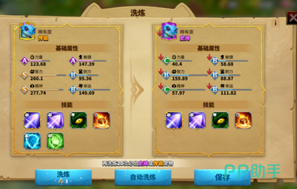 在洗练过程中,玩家需要根据自己的战斗需求,对宠物的属性进行精心选择。对于输出型宠物,可以优先提升攻击力和暴击率等属性;对于生存型宠物,则可以重点加强防御力和生命值等属性。洗练不仅可以改变宠物的属性值,还可能提升其稀有度和增加技能槽位。稀有度越高的宠物,其综合属性往往越优秀;而技能槽位越多,则意味着宠物可以装备更多的技能,进一步提升战斗力。每次洗练都是随机的,但游戏中通常设有保底机制。例如,每洗练20次必出史诗或传说稀有度宠物。因此,玩家在洗练过程中要保持耐心和理性,避免盲目追求高稀有度而忽略了属性的实际提升效果。除了属性洗练外,玩家还可以通过消耗同名同星的技能卡来提升宠物的技能星级。技能星级提升后,技能效果的数值将迎来巨大飞跃。因此,在洗练过程中,玩家也要注意收集和保留技能卡资源。