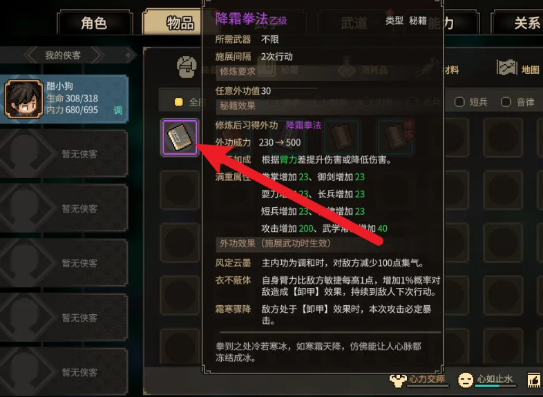 第二步,是在这众多秘籍中,寻找到“乙·降霜拳法”。直接点击它,就能够深入学习其中的精髓和奥义。