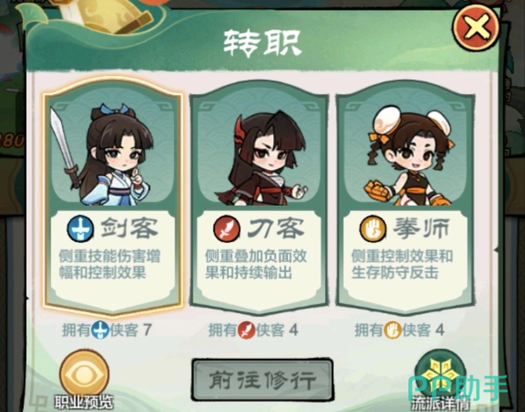 在转职的时候,我们总共有3种职业可以选择,分别是剑主、刀主以及拳王,这个三个职业在战斗时都有着不同的侧重方面,剑主是团队中核心输出位,这个职业不仅有着超高的爆发能力同时剑主的控制效果也相当出色,刀主则比较注重输出的续航能力以及各种减益,拳王这个职业的生存能力要比其他的两个职业好很多,不仅有着出色的防御能力,同时他的攻击能力也是比较不错的。