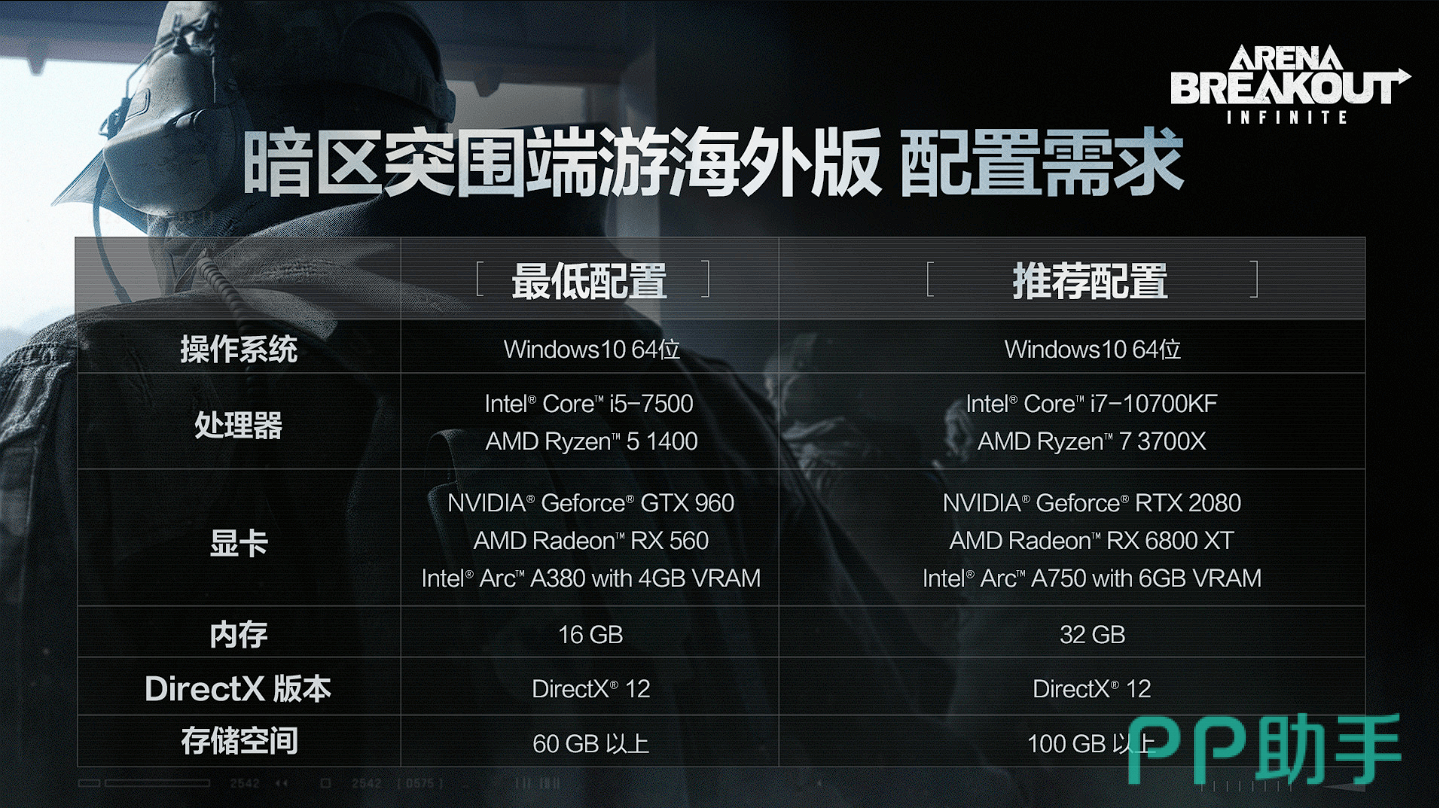 暗区突围无限在之前的测试阶段确实是对配置要求较高的游戏。它要求玩家拥有64位处理器和操作系统,以及至少16GB的RAM,以确保游戏运行的流畅性和稳定性。显卡方面,推荐配置更是达到了GeForce RTX 2080或Radeon RX 6800 XT的级别,这对于追求极致画面效果的玩家来说,无疑是一个不小的挑战。但是经过游戏优化之后,最乞版画质可以取到GEFORCE GTX960+、RAM不变,详细如上图,所以大家可以放心入手。