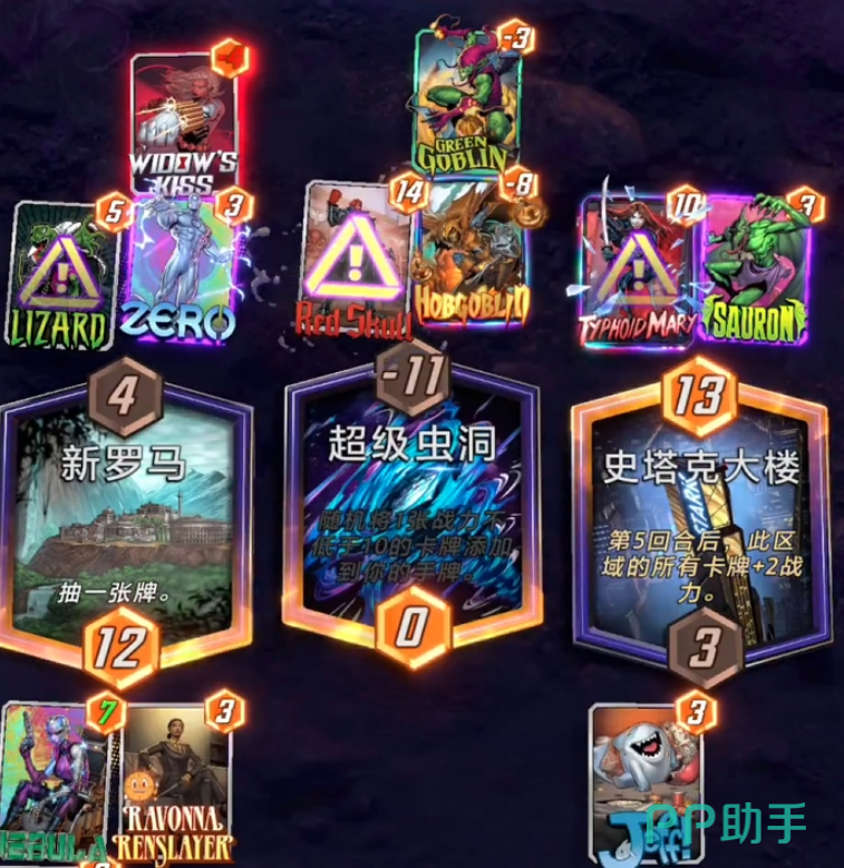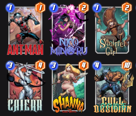 如果想要进行角色的搭配,那么就可以把松鼠女孩,蚁人还有山娜组成一支队伍,这几个角色的初始消耗点都只有一点,而且松鼠女孩和山娜在游戏里的技能是可以在其他区域里再去放置一张初始消耗为一的卡牌,这样就可以让黑耀霸王在放置的时候有更多的选择性,则是可以在游戏里这个角色在游戏里的设定是需要把当前区域放满,这样就能增加角色4点的战斗力。