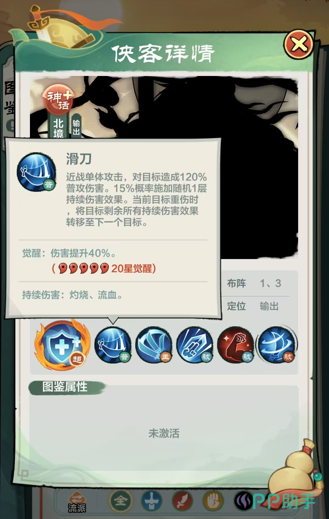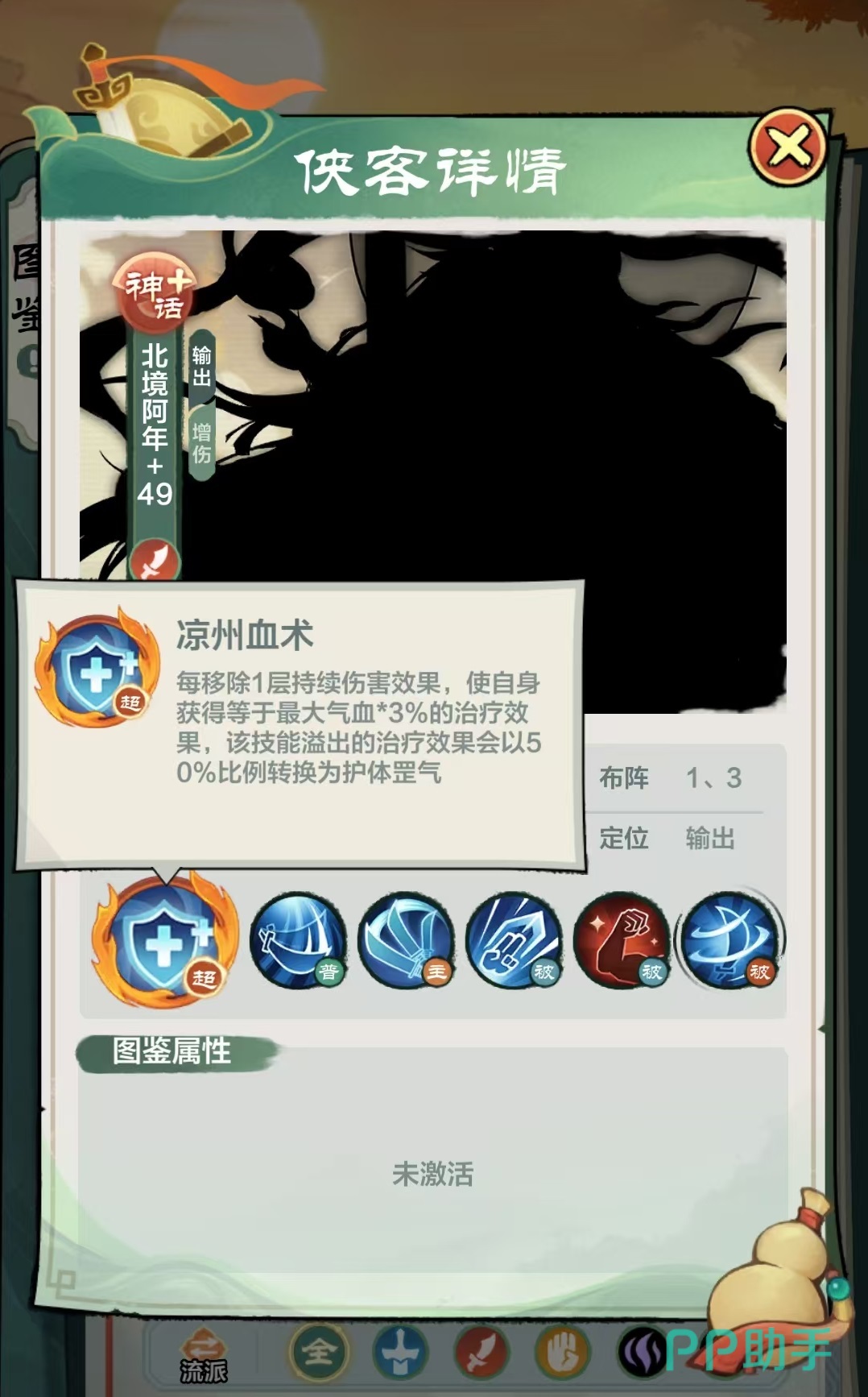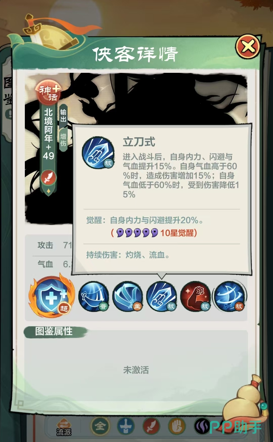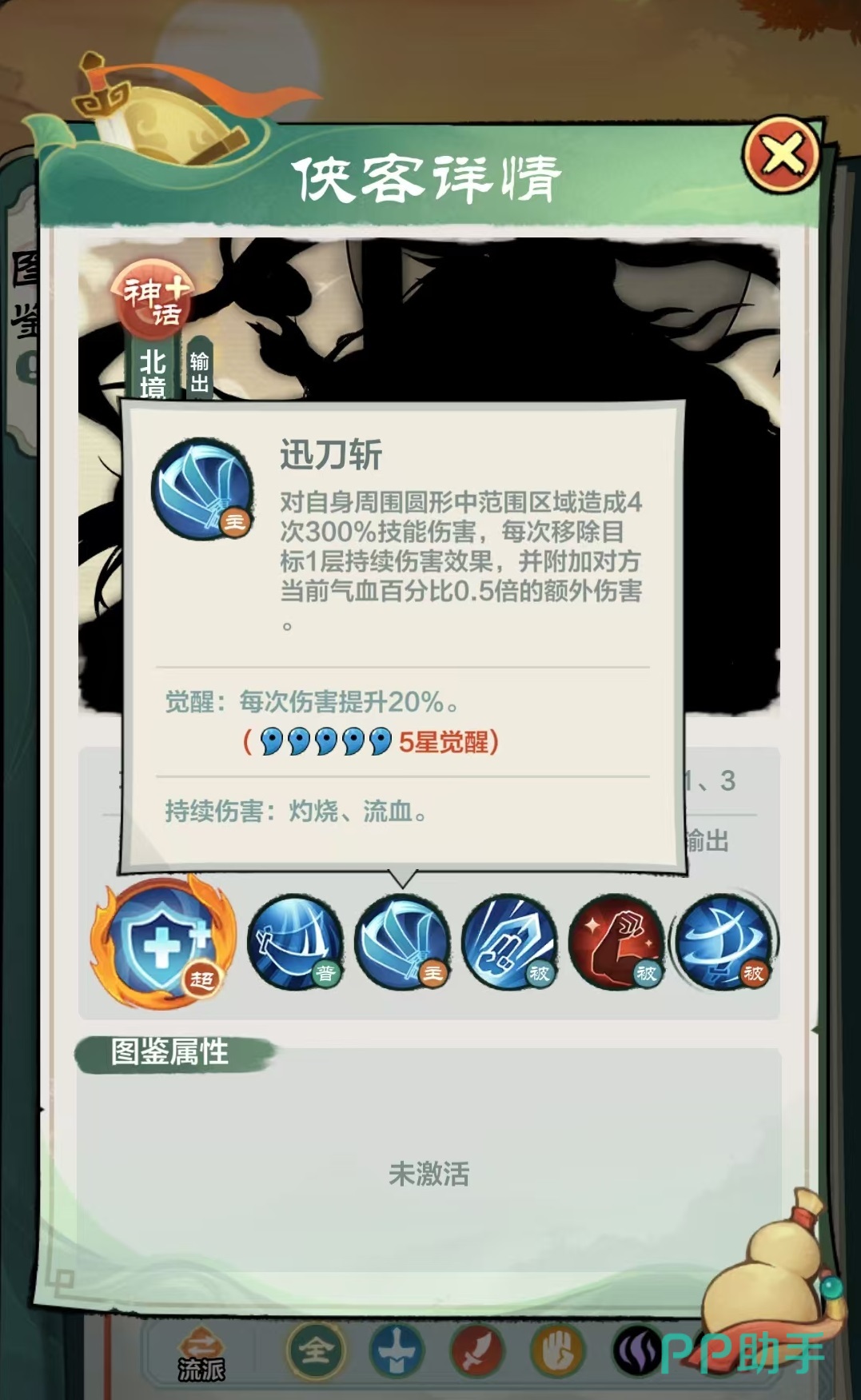 主要技能迅刀斩,以自身为圆心,对周围圆形范围内区域造成4次300%技能伤害,每次都会移除目标一层持续伤害效果,并按照对方当前血量百分比附加额外伤害。主动技能造成的持续伤害移除,同样也可以触发凉州血术效果,这样自身将会持续获得治疗。作为神话英雄,他拥有三个被动技能,第1个立刀式,进入战斗后自身内力、闪避与气血提升15%,当自身血量高于60%的时候,造成伤害增加15%,当自身血量低于60%的时候,受到伤害降低15%。这一被动效果就是高血量的时候伤害提升,低血量的时候受到的伤害降低,可攻可受,不愧是神话级别的伙伴。