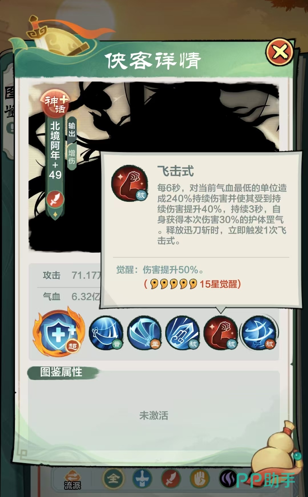 第2个被动飞击式,每6秒钟就能对当前血量最低的单位造成一次240%持续伤害,并使其受到持续伤害提升40%,持续三秒钟自身。获得本次伤害30%的护体罡气,在释放迅刀斩时,会立即触发一次飞击式。最后一个被动搬式,当己方移除敌方单位的持续伤害效果时,随机为该单位施加一层随机持续伤害效果。